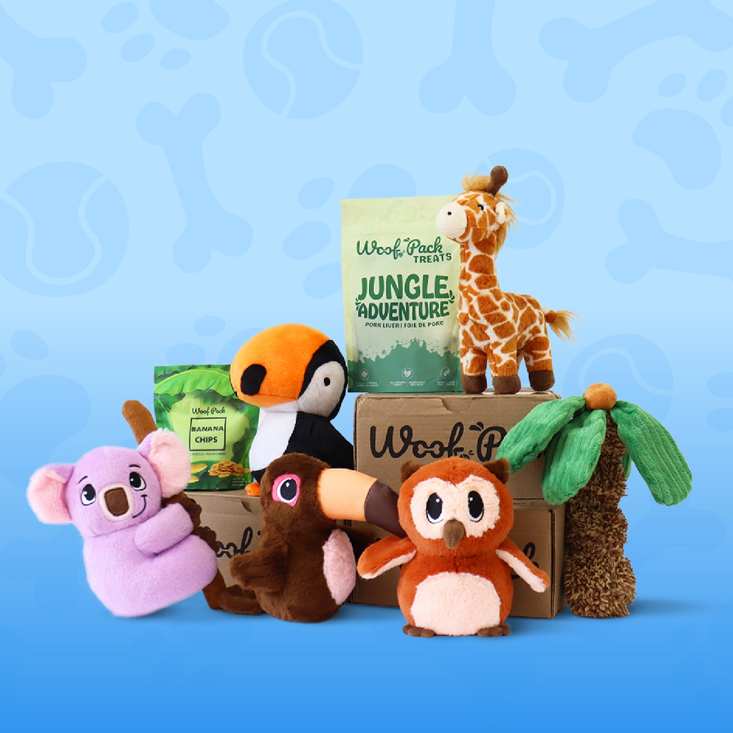 Each Woof Pack includes 4–5 premium items: 2 unique engaging, dog-tested toys and 2 bags of all-natural treats, valued at over $70. Every box is carefully curated with fun themes to keep your pup happy, healthy, and entertained each month.