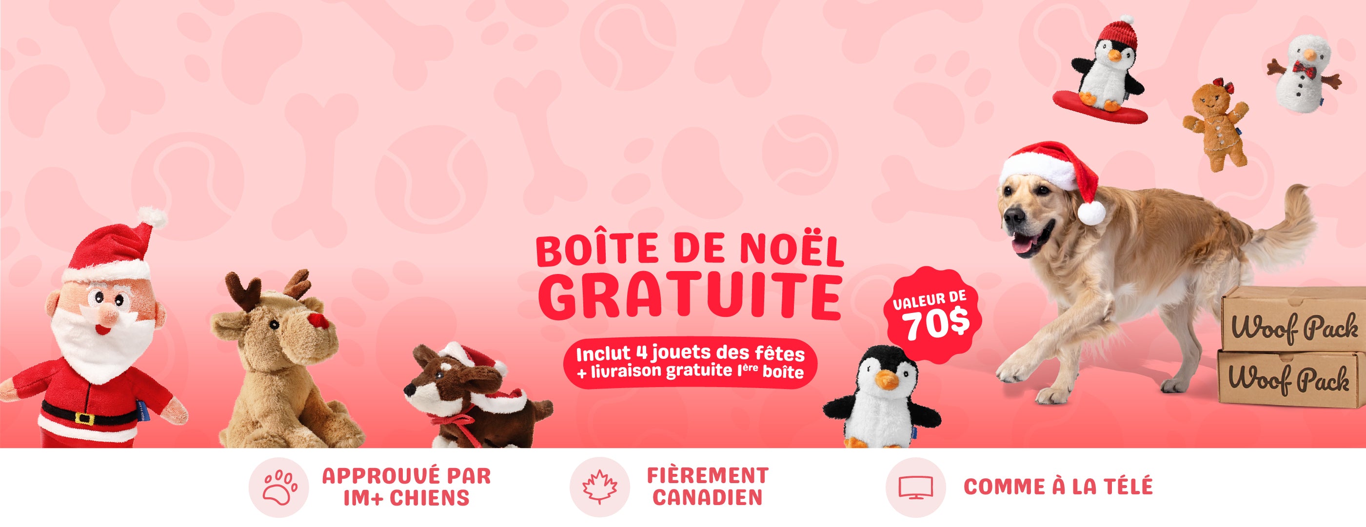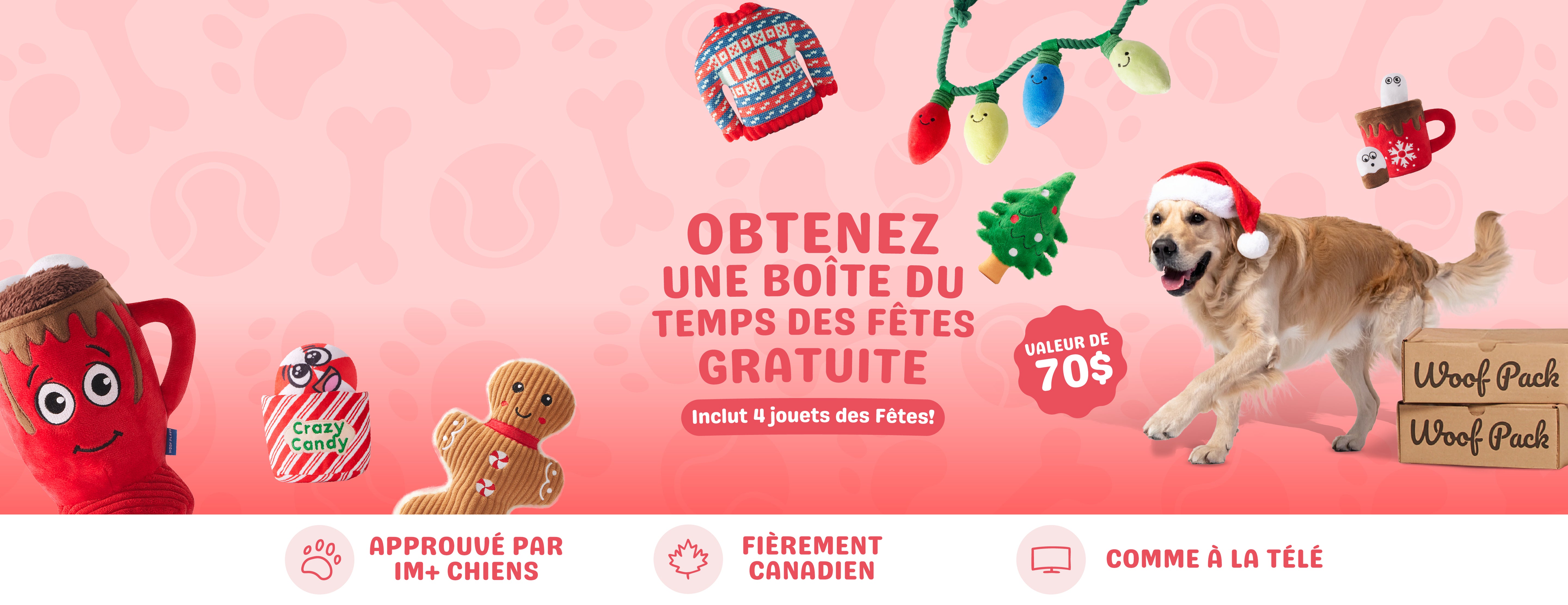 Woof Pack est la boîte d’abonnement pour chiens #1 au Canada, offrant le parfait mélange de gâteries canadiennes 100 % naturelles et de jouets uniques testés par de vrais chiens. Chaque produit respecte les normes canadiennes les plus strictes, pour que vous ayez toujours confiance dans ce que contient la boîte de votre compagnon.
