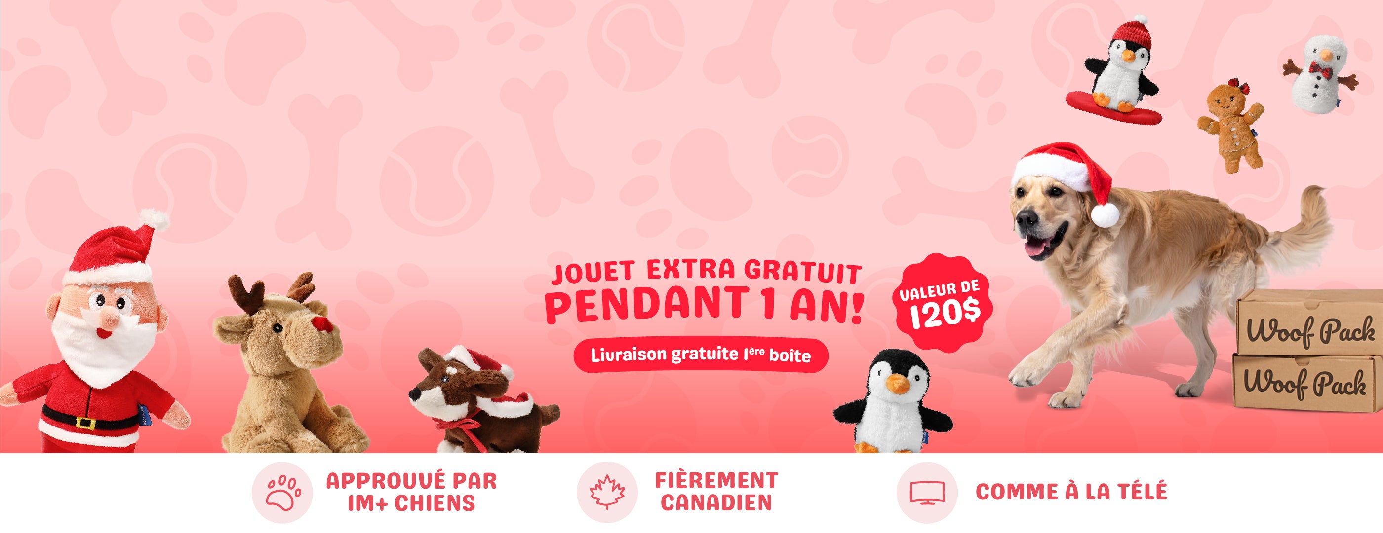 Chaque Woof Pack est adapté à la taille et aux besoins de votre chien. Construit autour d’un nouveau thème mensuel, il contient des jouets exclusifs et des gâteries canadiennes 100 % naturelles. Chaque envoi est conçu pour surprendre votre chien - et avec notre Garantie Bonheur, la satisfaction est toujours assurée
