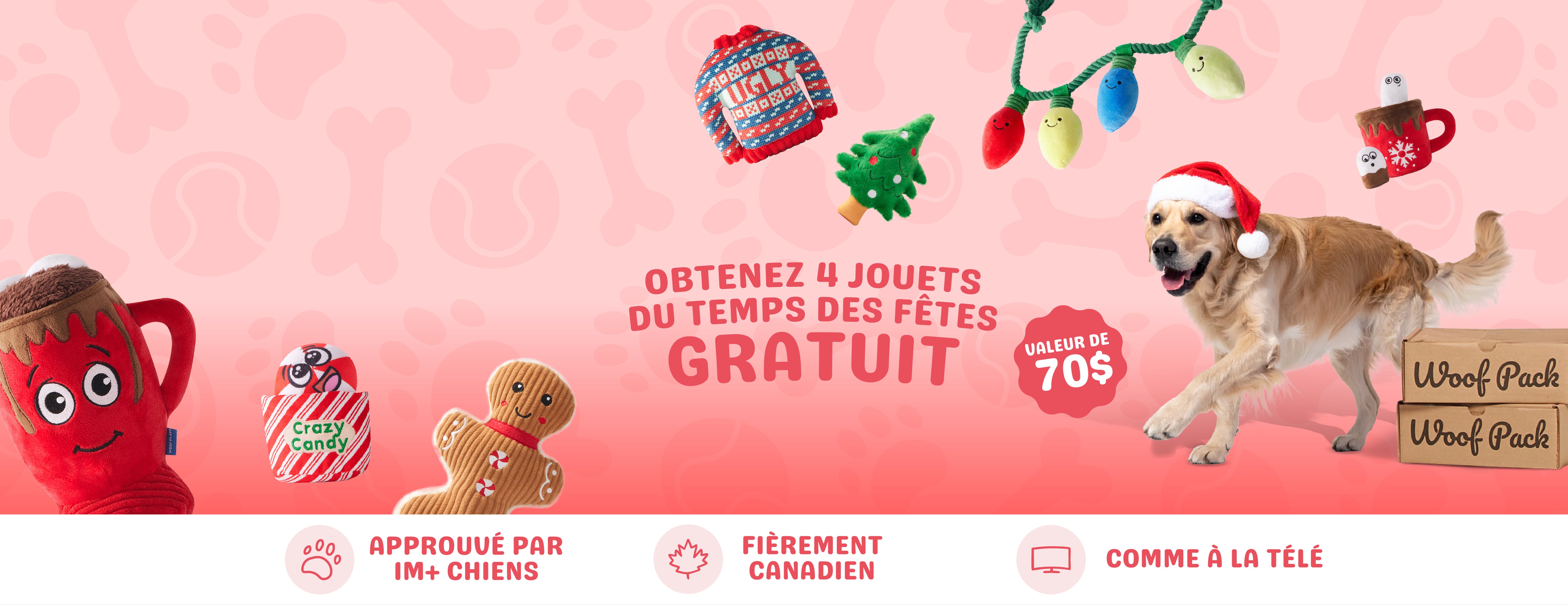 Chaque Woof Pack est adapté à la taille et aux besoins de votre chien. Construit autour d’un nouveau thème mensuel, il contient des jouets exclusifs et des gâteries canadiennes 100 % naturelles. Chaque envoi est conçu pour surprendre votre chien - et avec notre Garantie Bonheur, la satisfaction est toujours assurée