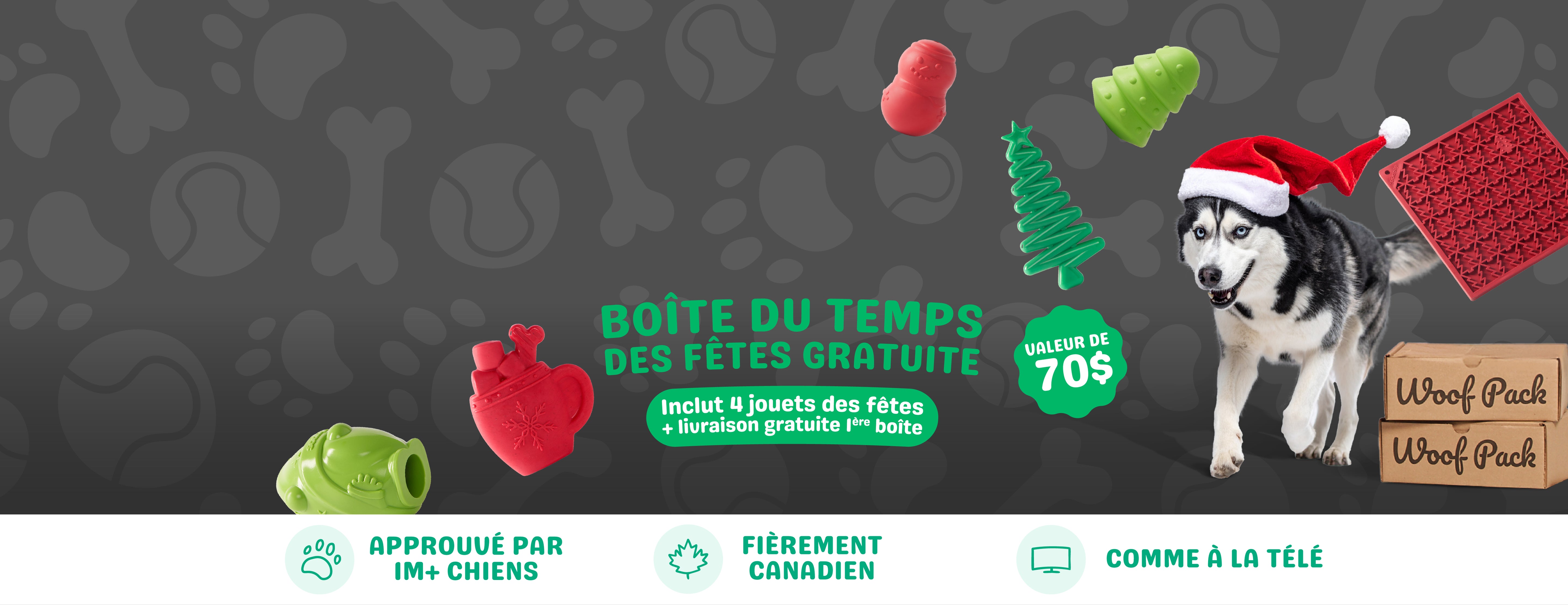 La Boîte Woof Pack régulière comprend des jouets et des gâteries amusants autour de thèmes variés, tandis que la Boîte Durable est conçue pour les chiens à la mâchoire puissante. Elle contient des jouets à l’épreuve des mâchouilleurs, fabriqués avec des matériaux plus solides, ainsi que des gâteries durables qui satisfont sans se désagréger trop vite.