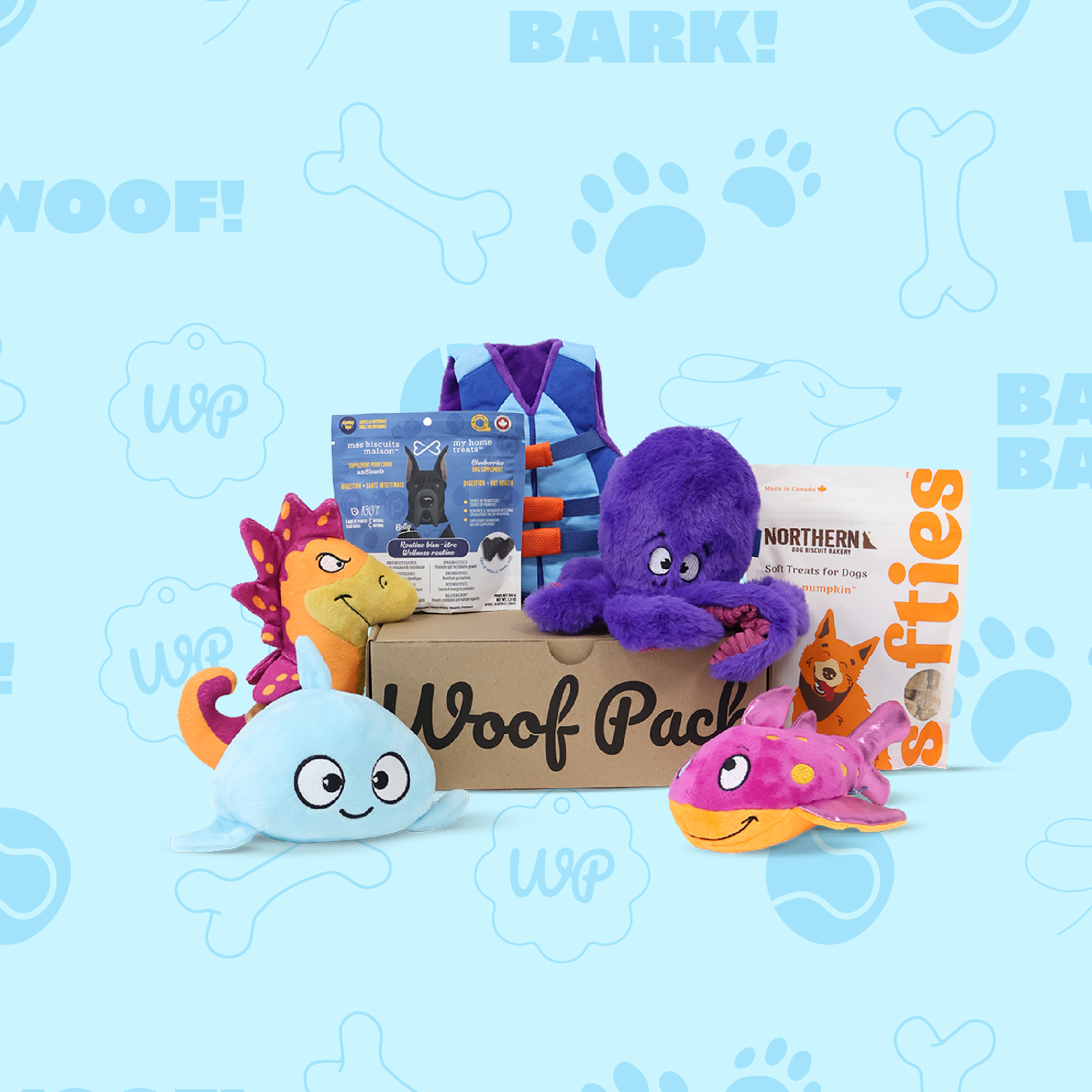 Chaque mois, votre chiot reçoit des jouets thématiques et des gùteries naturelles.