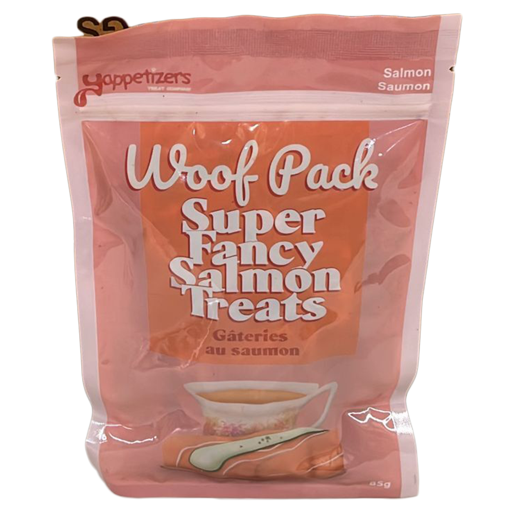 Yappetizers pure salmon dog treats are made from 100% wild salmon. This all-natural pure salmon dog treat contains no additives, preservatives or unnecessary fillers. This treats have a cracker/biscuit-like consistency which can be easily broken to the desired size pieces. These treats are great for use as training and reward treats.