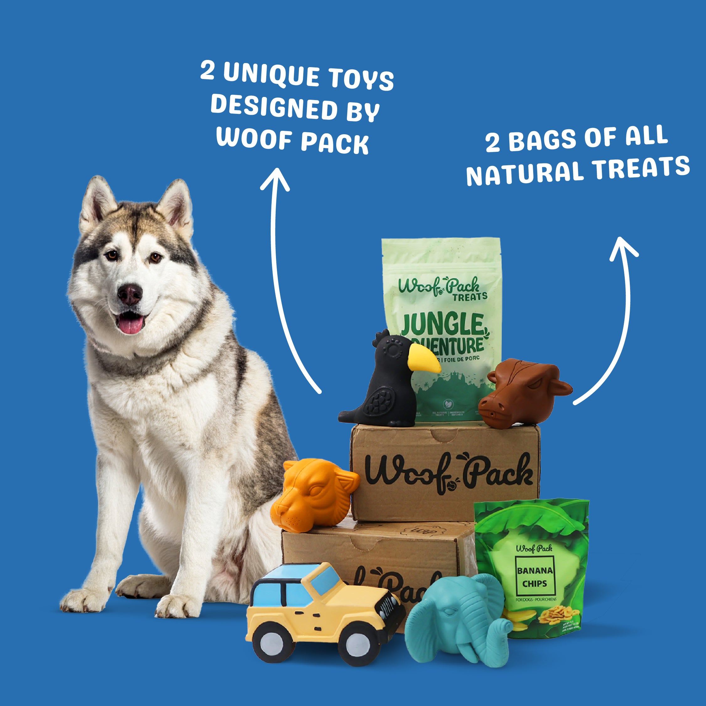 The Super Chewer Box is for dogs with a tough bite! Each box contains durable dog toys and healthy treats.